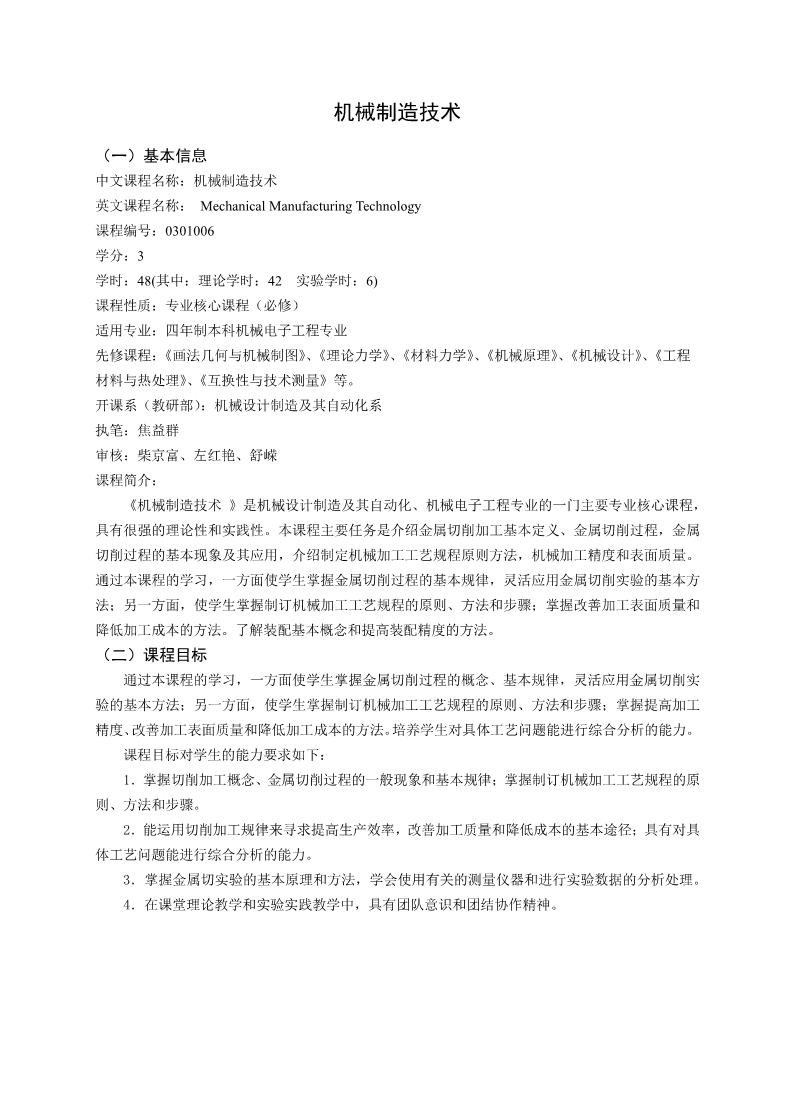 机械制造技术教学大纲